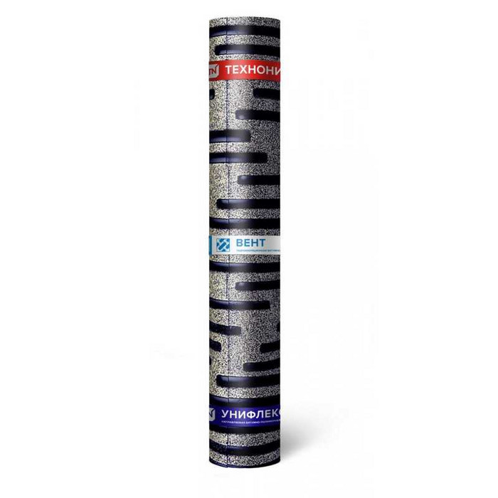 Унифлекс ВЕНТ получают путем двустороннего нанесения на полиэфирную основу битумно-полимерного вяжущего, состоящего из битума, СБС (стирол-бутадиен-стирол) полимерного модификатора и минерального наполнителя (тальк, доломит и др.). В качестве защитного слоя используют крупнозернистую (сланец) посыпку или полимерное покрытие сверху и вентилируемую поверхность снизу. Вентилируемая поверхность имеет полоски из битумно-полимерного вяжущего, пространство между которыми заполнено мелкофракционным песком и вся поверхность покрыта тонкой полимерной пленкой.