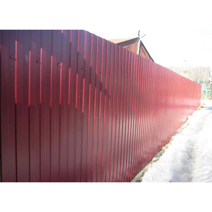 Профилированный лист С-8x1150-A (ПЭ-01-3005-0,7) — популярный материал в Обнинске для монтажа забора. Изначально он представляет собой металлический оцинкованный лист с покрытием. Толщина стальной основы с цинковым и защитно-декоративным слоем составляет 0.7 мм. Проходя процедуру холодного проката, сталь принимает волнообразный вид. Несущая способность такого листа на порядок выше плоского.