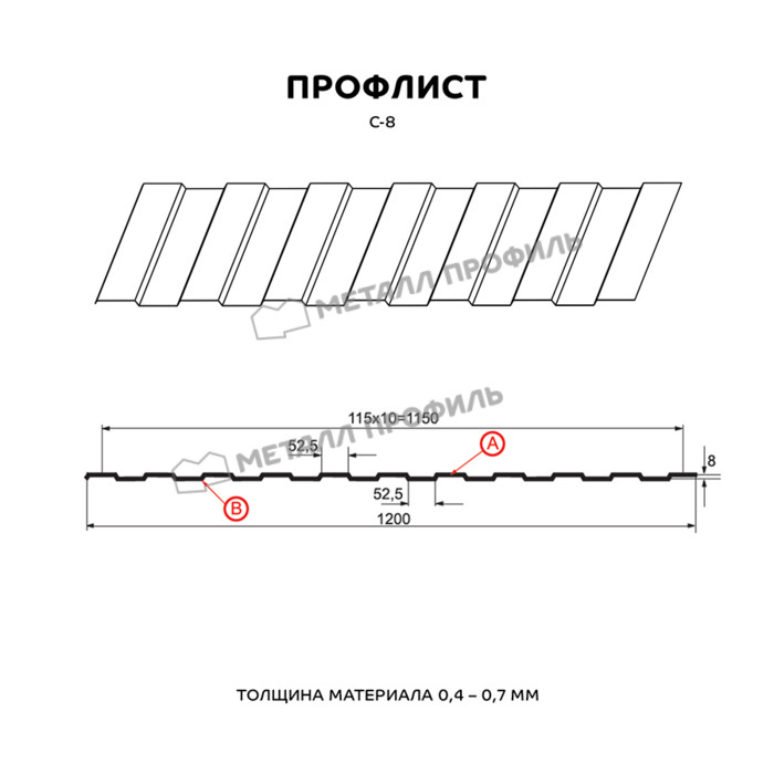 Профнастил с наиболее маленькой волной в линейке Компании Металл Профиль. Назначение профиля С-8 – в большей степени дизайнерская функция, нежели прочностная. Профлист с высотой 8 мм замечательно подходит для таких задач, как: системы подвесных потолков, постройка заборов, не подверженных высоким климатическим нагрузкам, создание вентилируемых фасадов, внутренняя облицовка промышленных строений. Симметричная конфигурация профиля делает С-8 универсальным исходным материалом для различных дизайнерских решений. Оптимальная толщина стали – от 0,4 до 0,7 мм даёт возможность профлисту прекрасно справляться с любым своим назначением. А большая полезная ширина (1150 мм) помогает сэкономить на закупке профлистов. По вашему заказу мы можем изготовить листы металлопроката длиной от 0,5 до 12 метров.